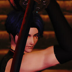 ᯽ Z has features from both sides of his family. He has a hooked Hyur like nose and long Viera like ears. He is tall and toned, with wide shoulders and small hips. His hair is black with blue bangs and highlights. He has some unusual features that neither Hyur nor Viera have. His eyes are a glowing red with slit like pupils. He has a set of sharp canines as well. He is often seen in blue robes or traveling gear, but seemingly always wears a blue moon pendant either on his ear or around his neck. ᯽